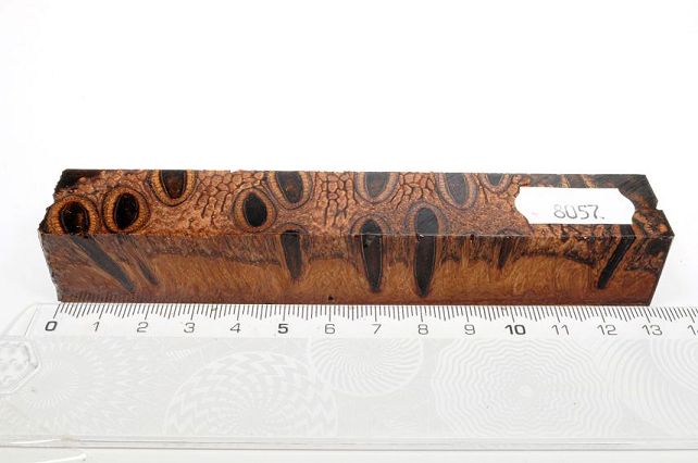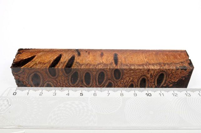 Die Samenöffnungen wurden mit gefärbtem Kunstharz unter Vakuum verfüllt und zu Pen Blanks verarbeitet