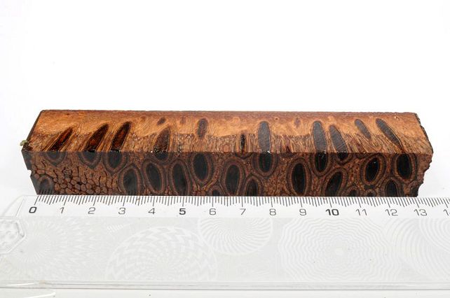 Die Samenöffnungen wurden mit gefärbtem Kunstharz unter Vakuum verfüllt und zu Pen Blanks verarbeitet