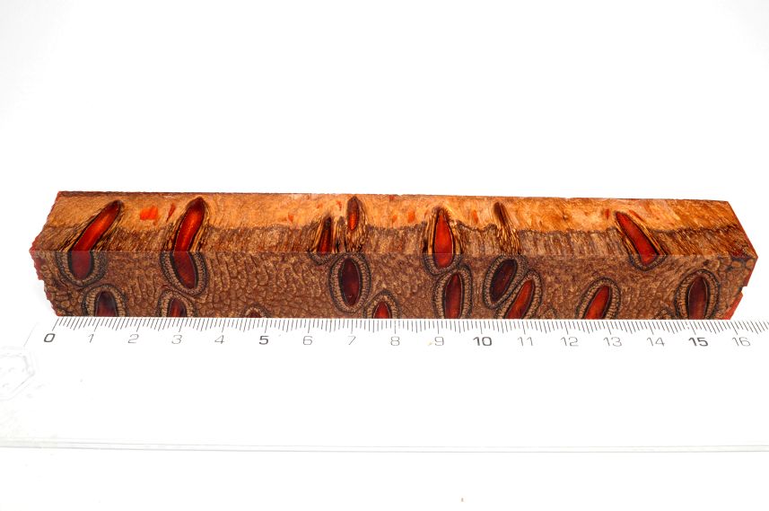 Die Samenöffnungen wurden mit gefärbtem Kunstharz unter Vakuum verfüllt und zu Pen Blanks verarbeitet