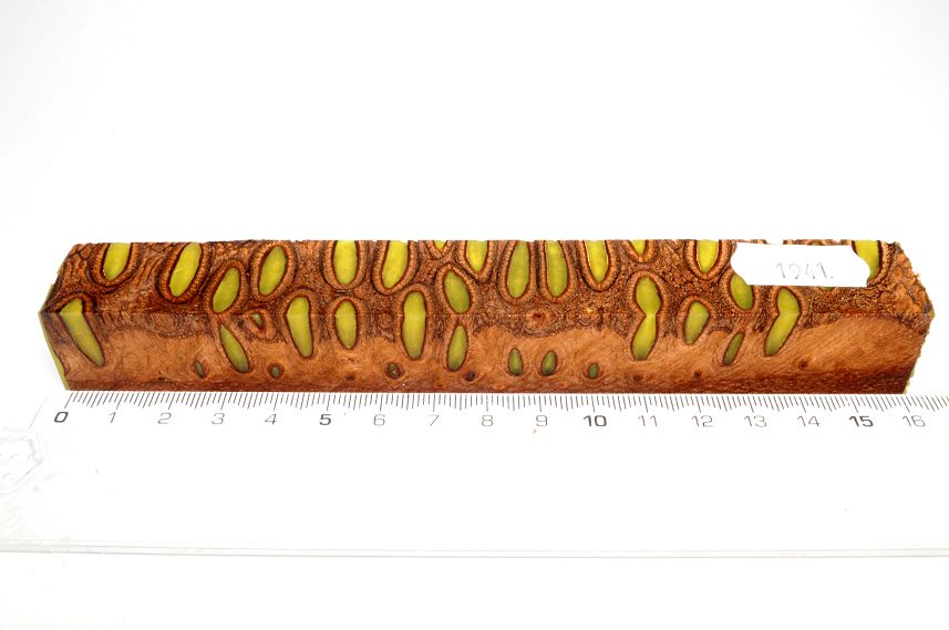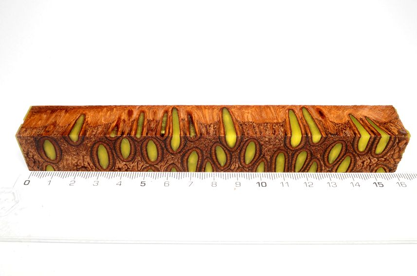 Die Samenöffnungen wurden mit gefärbtem Kunstharz unter Vakuum verfüllt und zu Pen Blanks verarbeitet