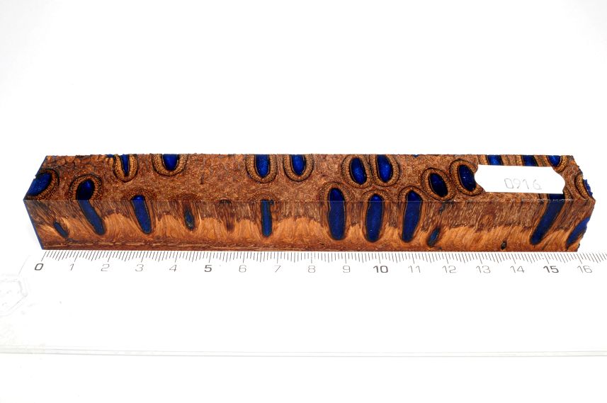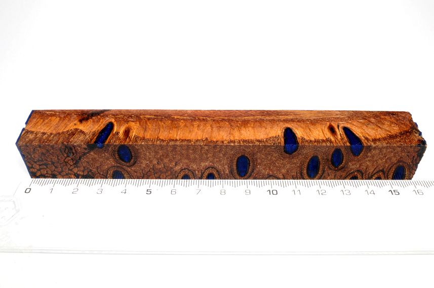 Die Samenöffnungen wurden mit gefärbtem Kunstharz unter Vakuum verfüllt und zu Pen Blanks verarbeitet