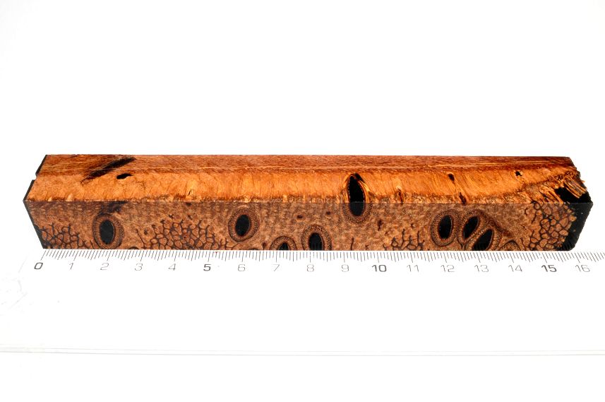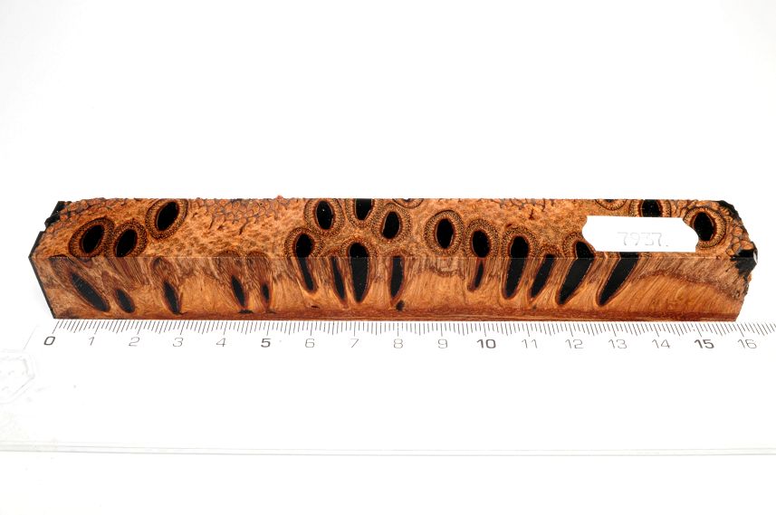 Die Samenöffnungen wurden mit gefärbtem Kunstharz unter Vakuum verfüllt und zu Pen Blanks verarbeitet