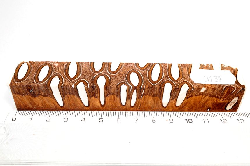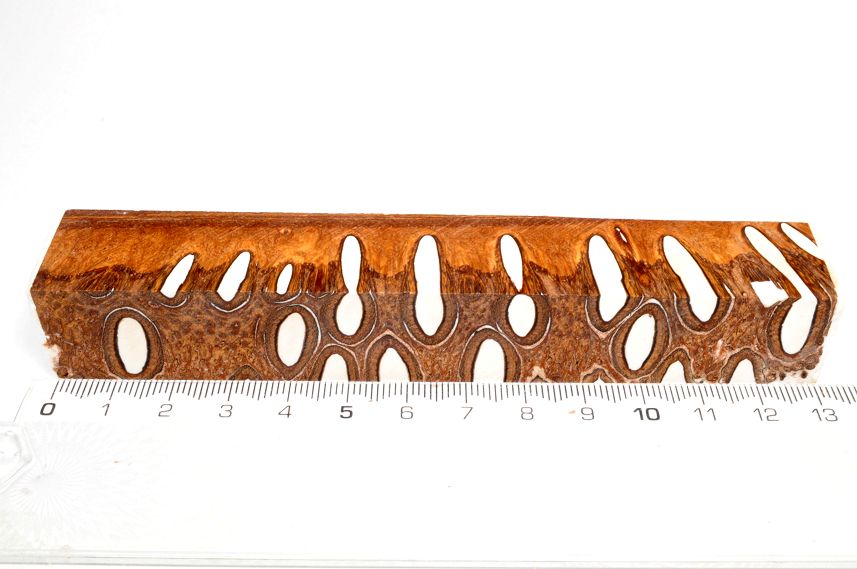 Die Samenöffnungen wurden mit gefärbtem Kunstharz unter Vakuum verfüllt und zu Pen Blanks verarbeitet