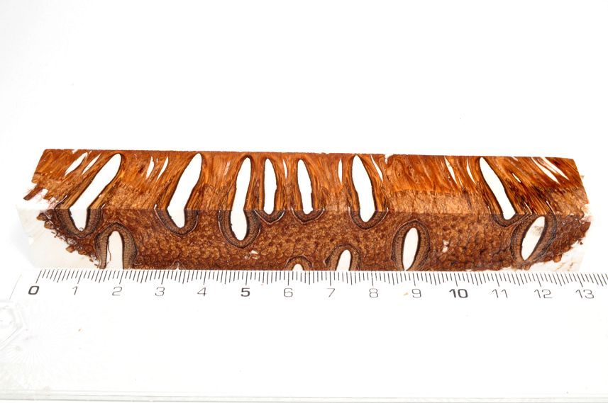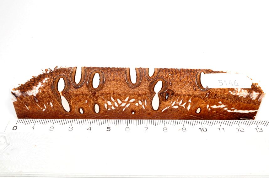 Die Samenöffnungen wurden mit gefärbtem Kunstharz unter Vakuum verfüllt und zu Pen Blanks verarbeitet