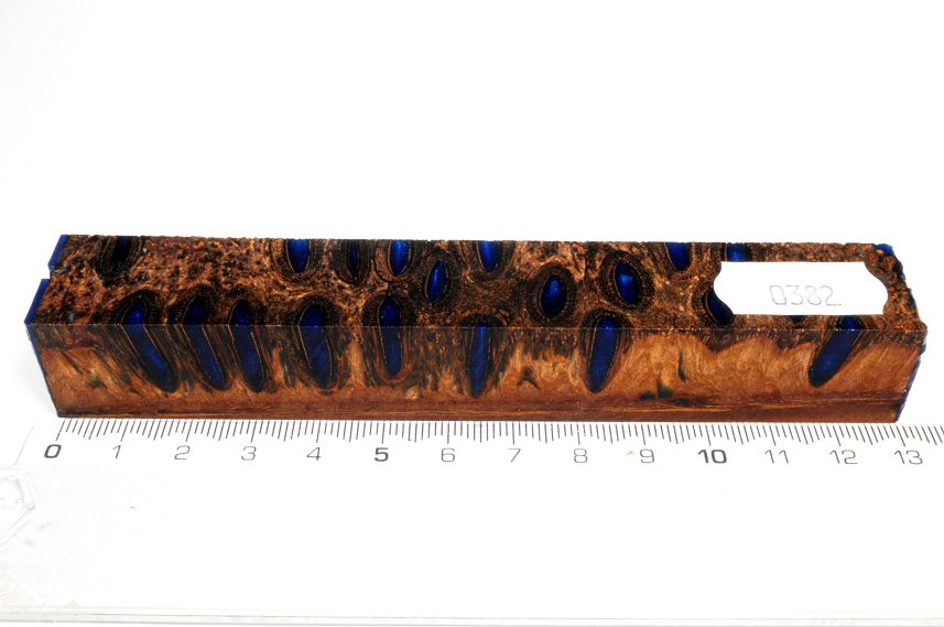 Die Samenöffnungen wurden mit gefärbtem Kunstharz unter Vakuum verfüllt und zu Pen Blanks verarbeitet