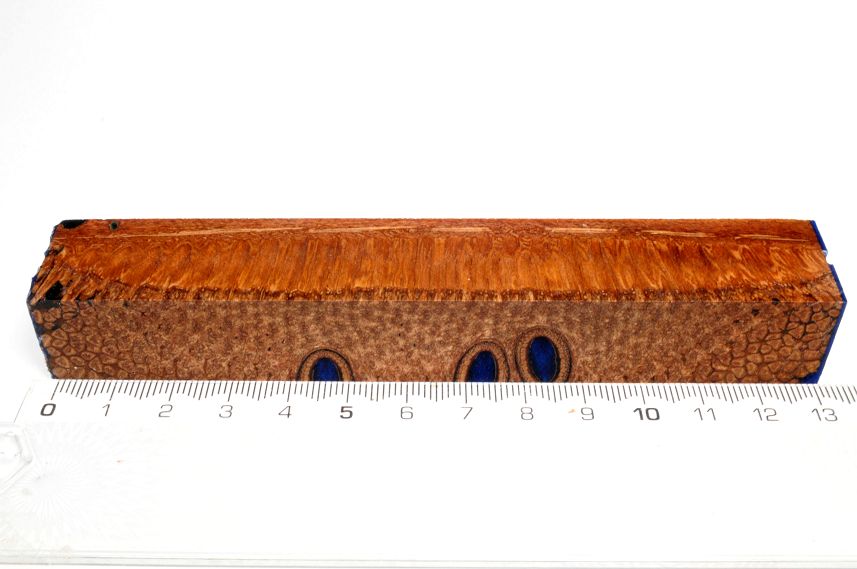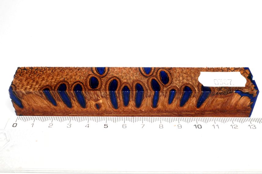 Die Samenöffnungen wurden mit gefärbtem Kunstharz unter Vakuum verfüllt und zu Pen Blanks verarbeitet