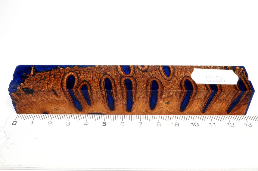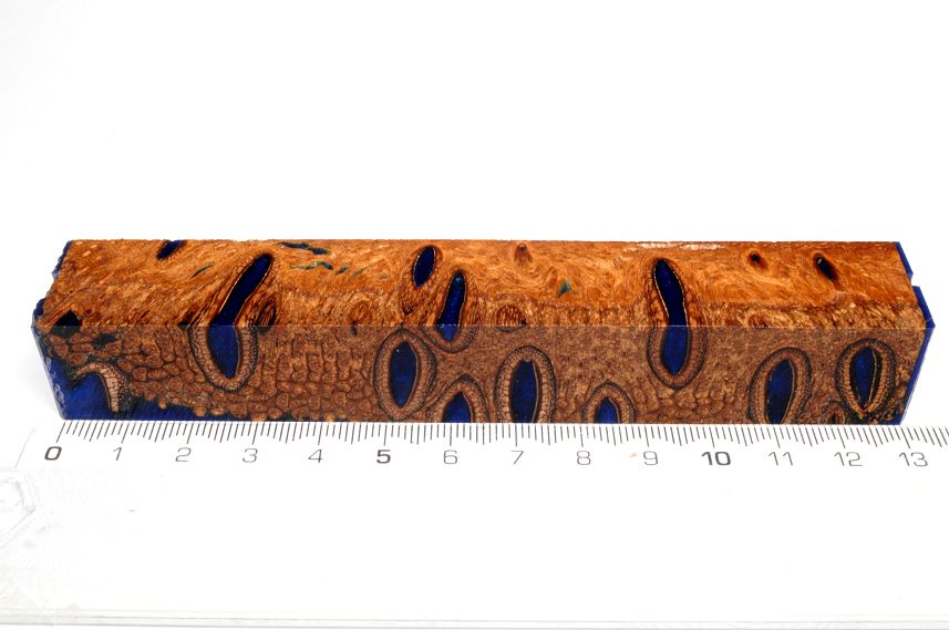 Die Samenöffnungen wurden mit gefärbtem Kunstharz unter Vakuum verfüllt und zu Pen Blanks verarbeitet