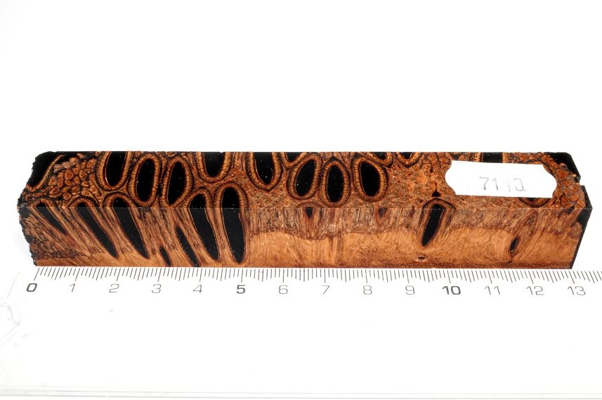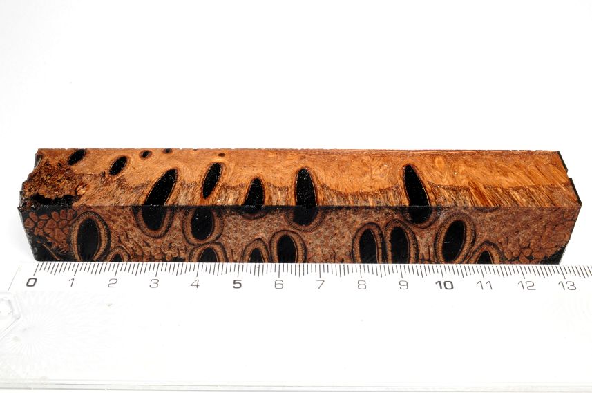Die Samenöffnungen wurden mit gefärbtem Kunstharz unter Vakuum verfüllt und zu Pen Blanks verarbeitet