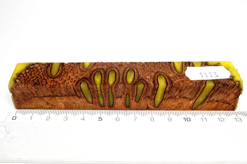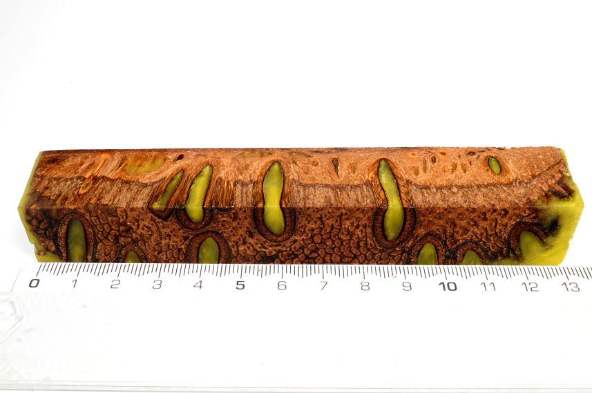 Die Samenöffnungen wurden mit gefärbtem Kunstharz unter Vakuum verfüllt und zu Pen Blanks verarbeitet
