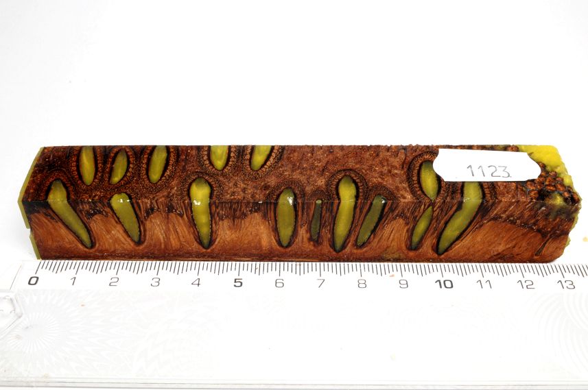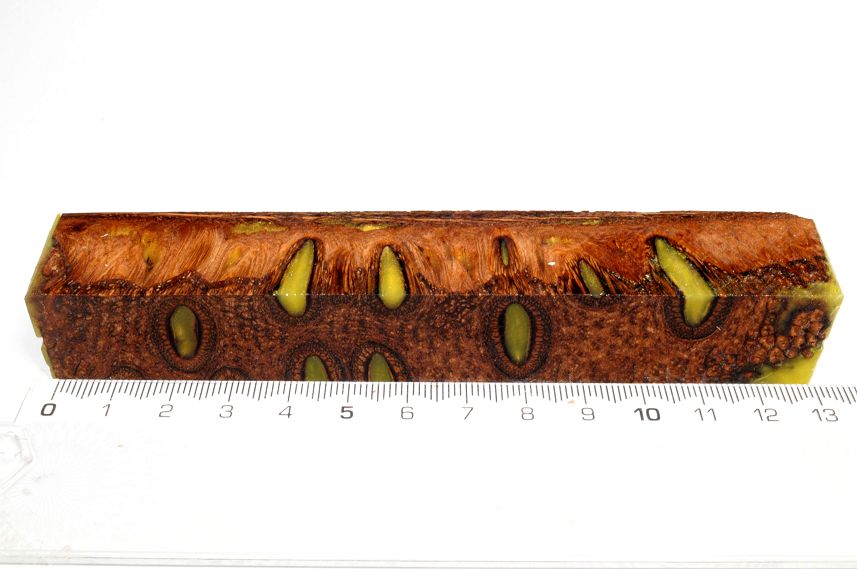 Die Samenöffnungen wurden mit gefärbtem Kunstharz unter Vakuum verfüllt und zu Pen Blanks verarbeitet