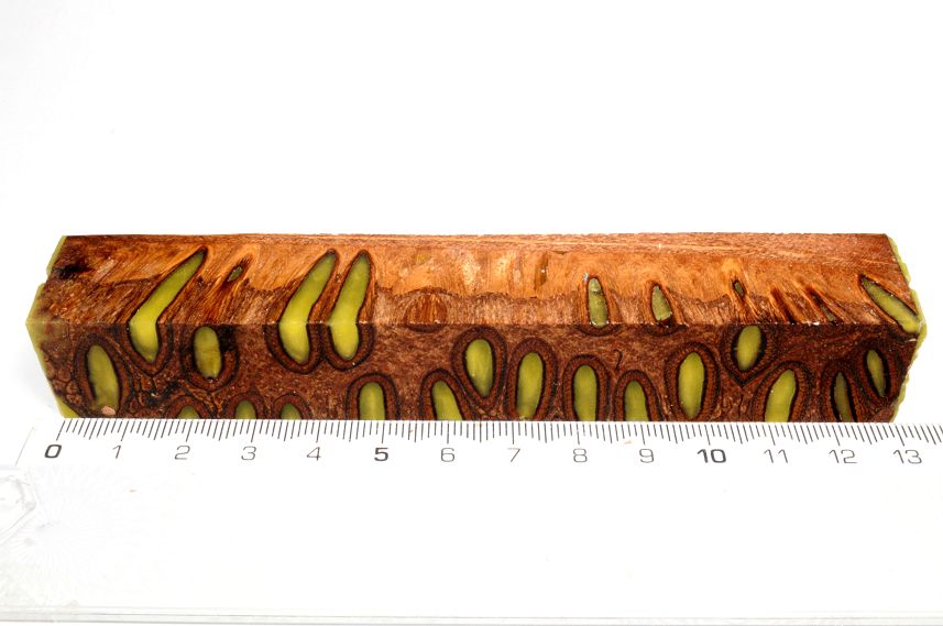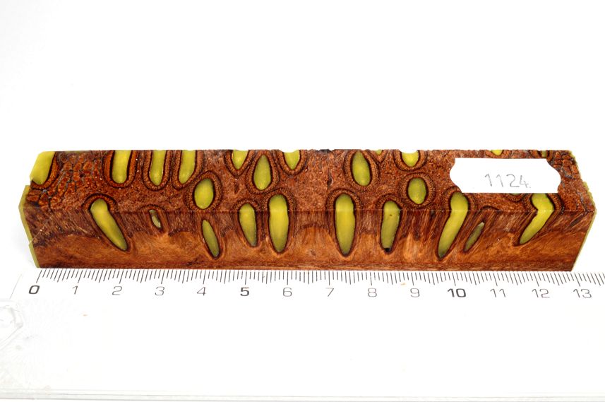 Die Samenöffnungen wurden mit gefärbtem Kunstharz unter Vakuum verfüllt und zu Pen Blanks verarbeitet