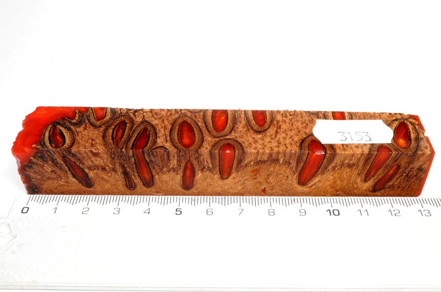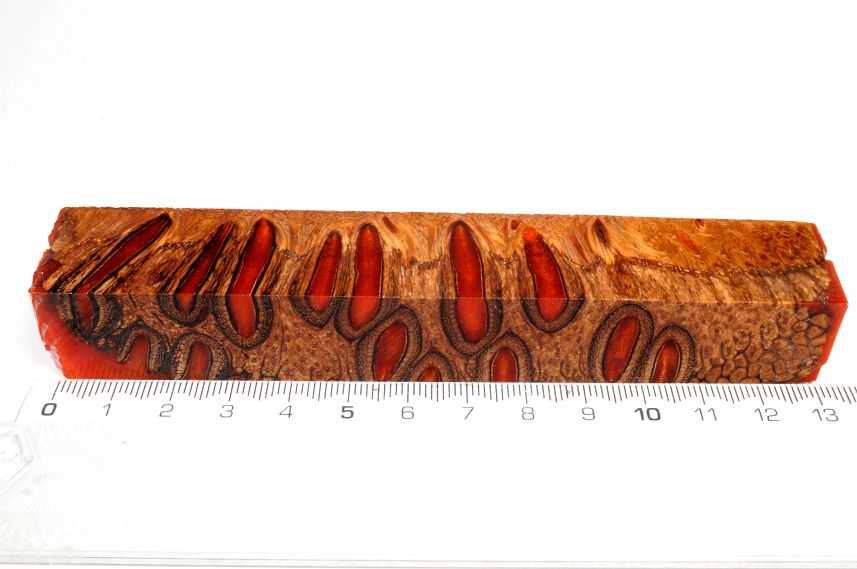 Die Samenöffnungen wurden mit gefärbtem Kunstharz unter Vakuum verfüllt und zu Pen Blanks verarbeitet