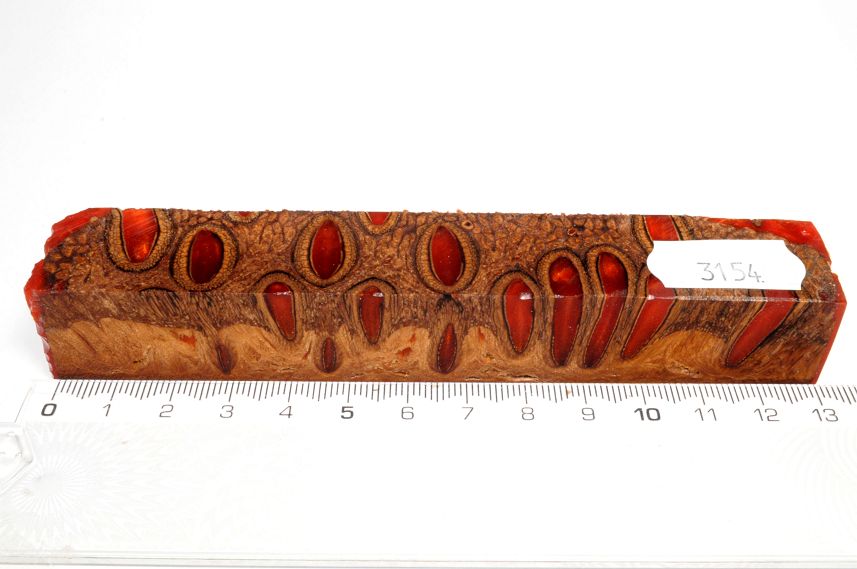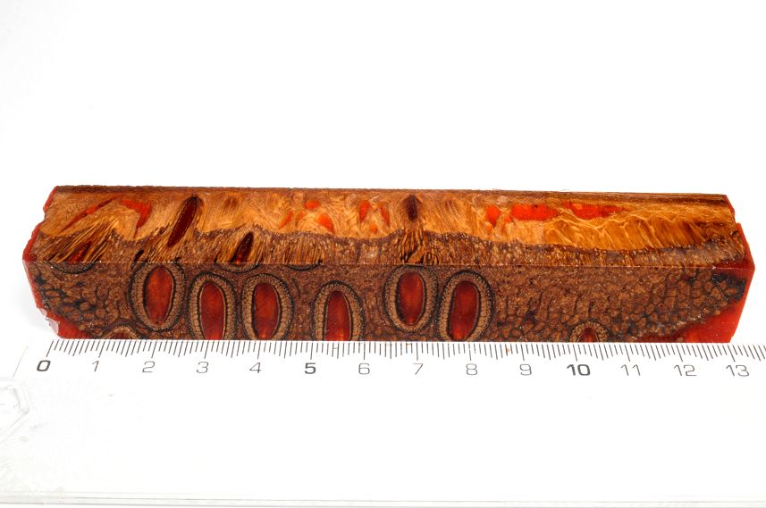 Die Samenöffnungen wurden mit gefärbtem Kunstharz unter Vakuum verfüllt und zu Pen Blanks verarbeitet
