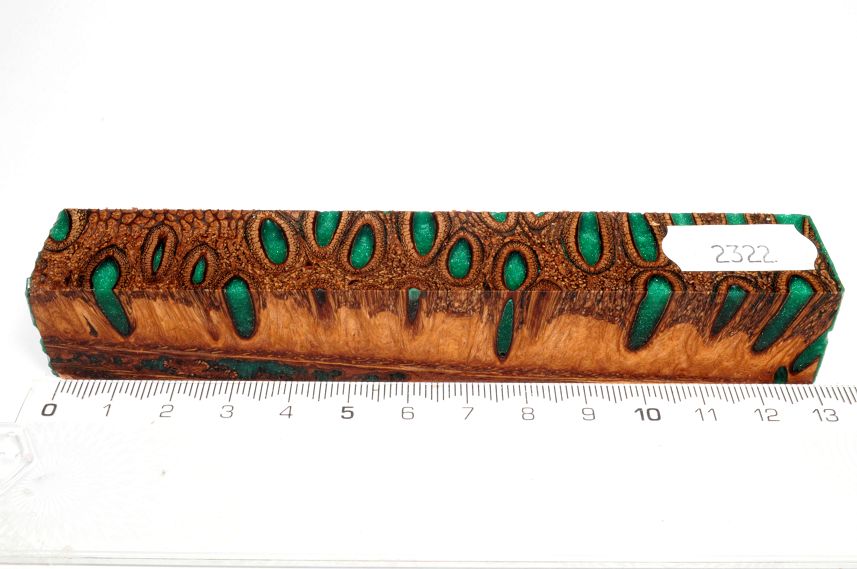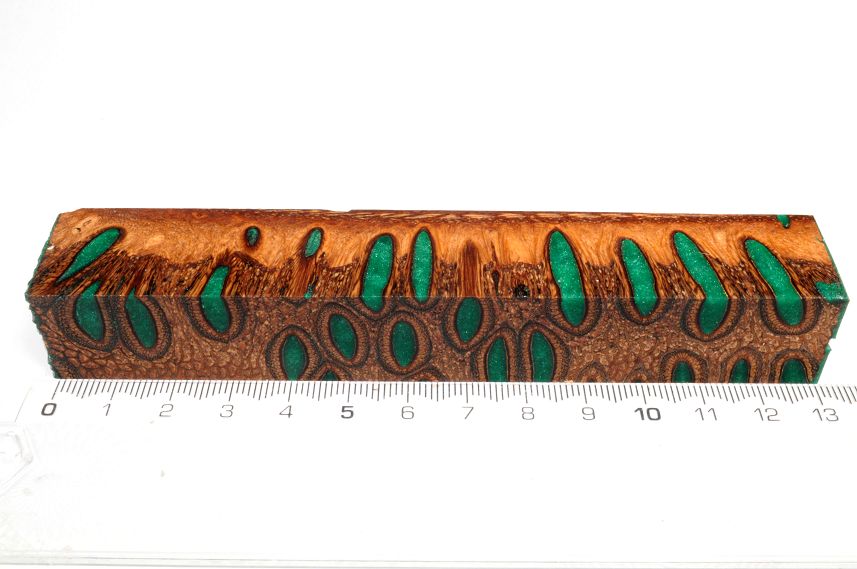 Die Samenöffnungen wurden mit gefärbtem Kunstharz unter Vakuum verfüllt und zu Pen Blanks verarbeitet