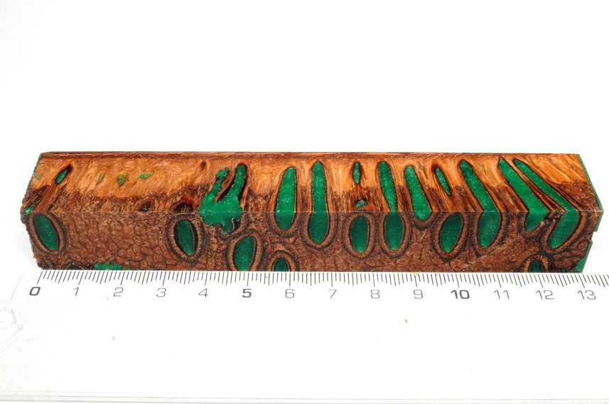 Die Samenöffnungen wurden mit gefärbtem Kunstharz unter Vakuum verfüllt und zu Pen Blanks verarbeitet