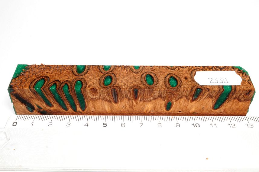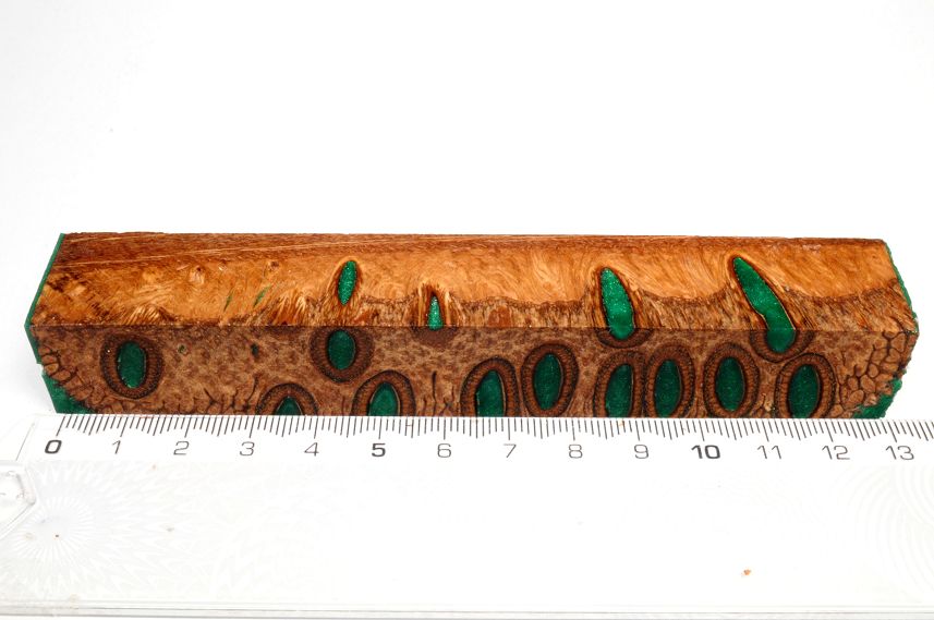 Die Samenöffnungen wurden mit gefärbtem Kunstharz unter Vakuum verfüllt und zu Pen Blanks verarbeitet
