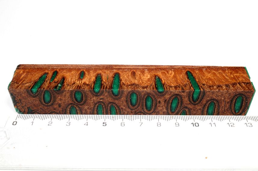 Die Samenöffnungen wurden mit gefärbtem Kunstharz unter Vakuum verfüllt und zu Pen Blanks verarbeitet