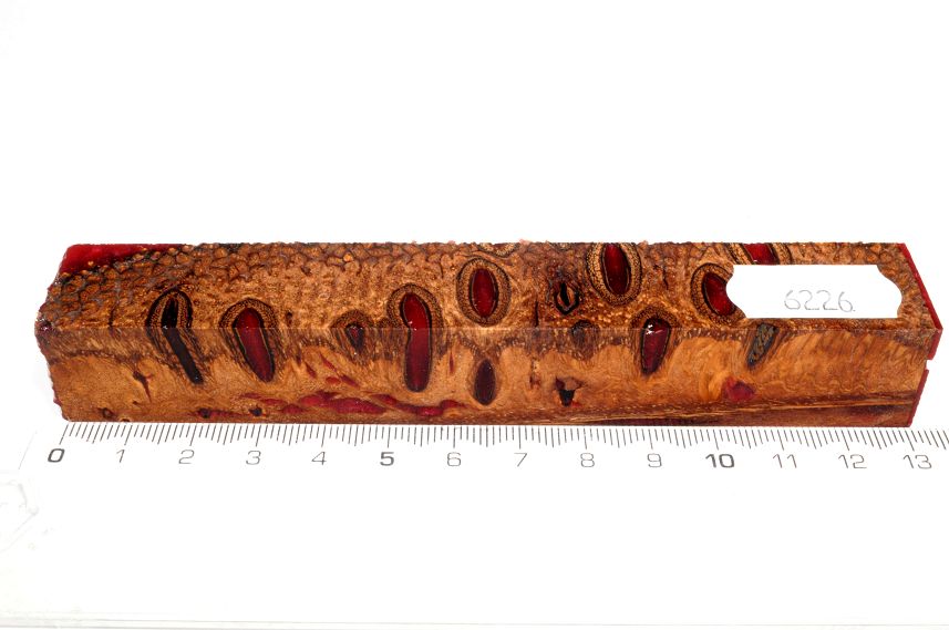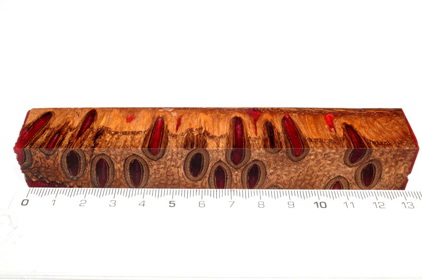 Die Samenöffnungen wurden mit gefärbtem Kunstharz unter Vakuum verfüllt und zu Pen Blanks verarbeitet