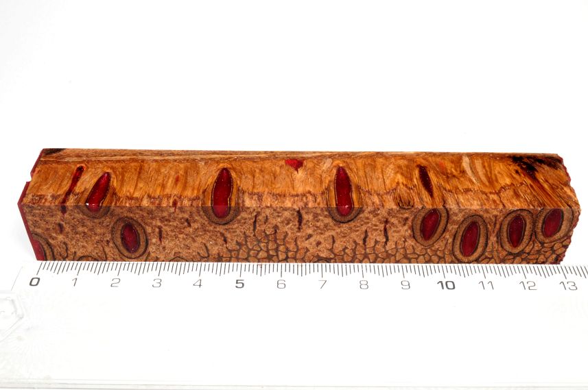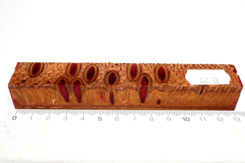 Die Samenöffnungen wurden mit gefärbtem Kunstharz unter Vakuum verfüllt und zu Pen Blanks verarbeitet