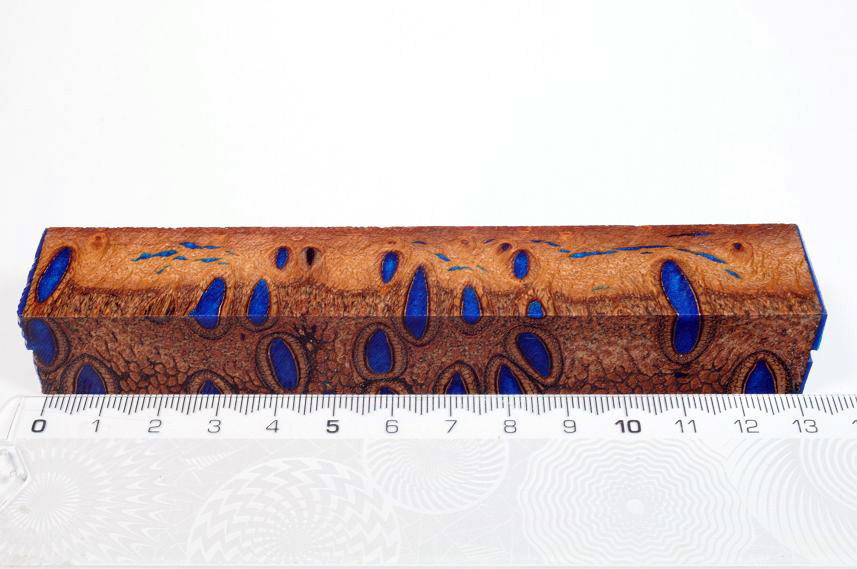 Die Samenöffnungen wurden mit gefärbtem Kunstharz unter Vakuum verfüllt und zu Pen Blanks verarbeitet