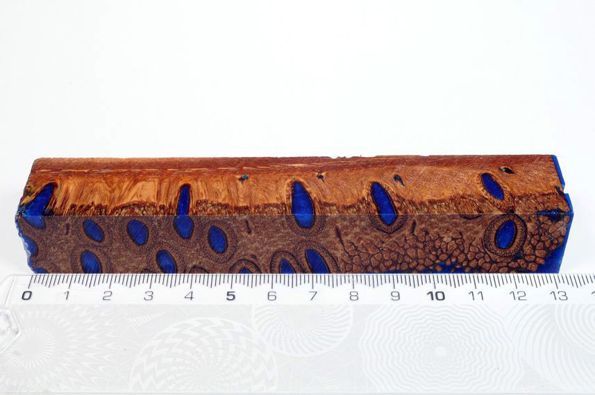 Die Samenöffnungen wurden mit gefärbtem Kunstharz unter Vakuum verfüllt und zu Pen Blanks verarbeitet