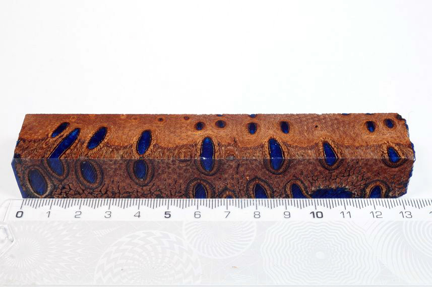 Die Samenöffnungen wurden mit gefärbtem Kunstharz unter Vakuum verfüllt und zu Pen Blanks verarbeitet