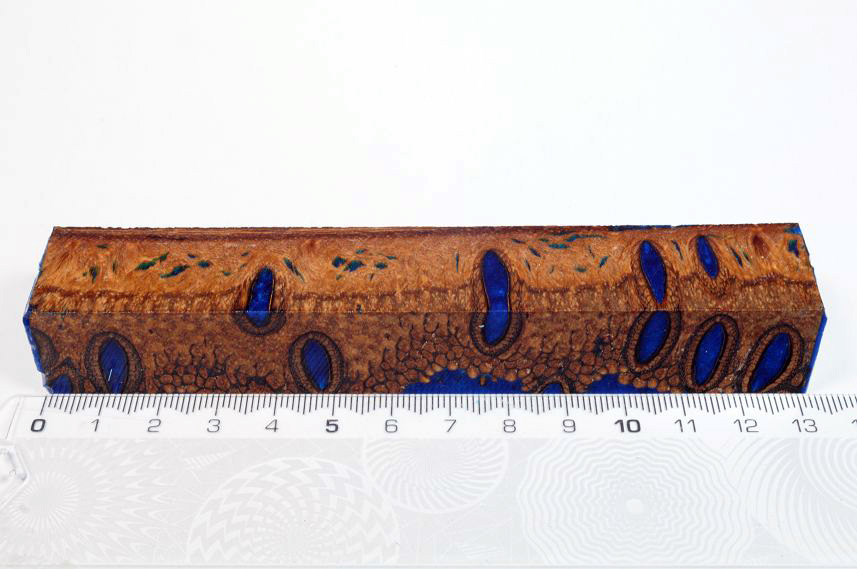 Die Samenöffnungen wurden mit gefärbtem Kunstharz unter Vakuum verfüllt und zu Pen Blanks verarbeitet