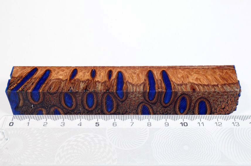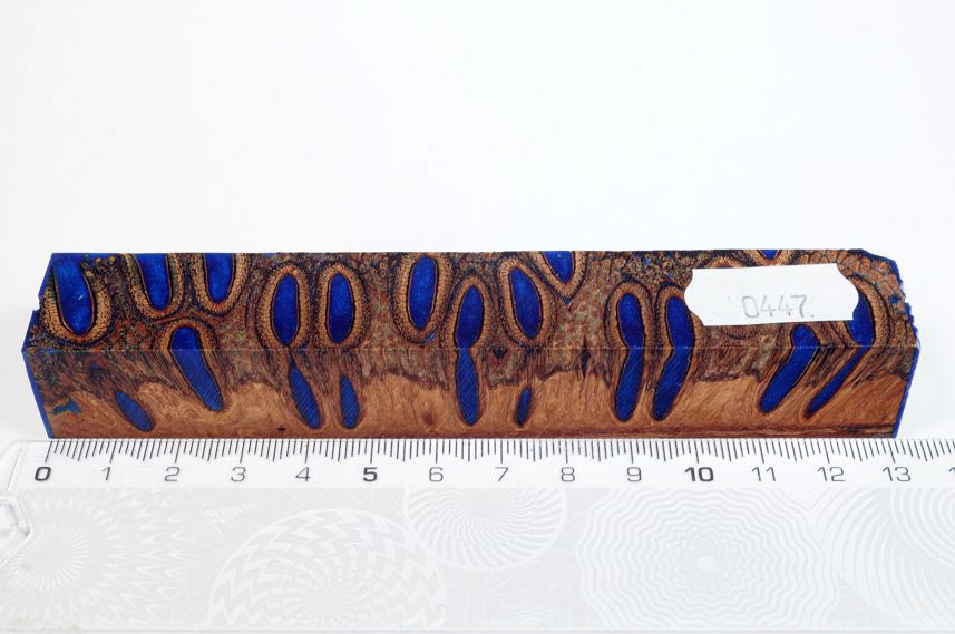 Die Samenöffnungen wurden mit gefärbtem Kunstharz unter Vakuum verfüllt und zu Pen Blanks verarbeitet