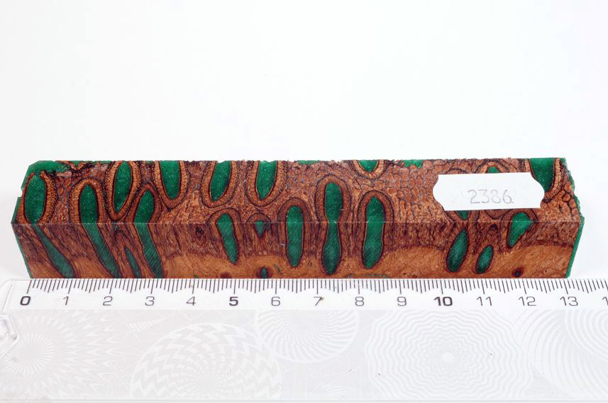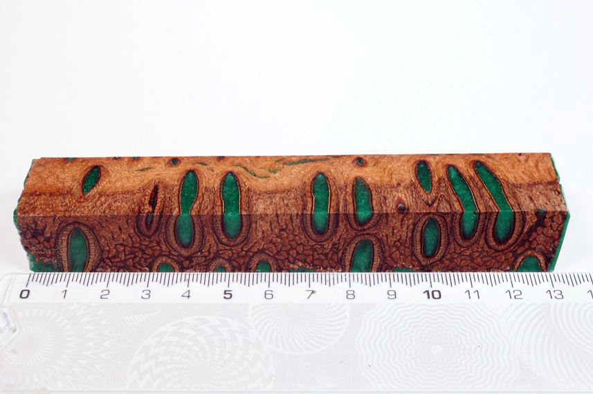 Die Samenöffnungen wurden mit gefärbtem Kunstharz unter Vakuum verfüllt und zu Pen Blanks verarbeitet