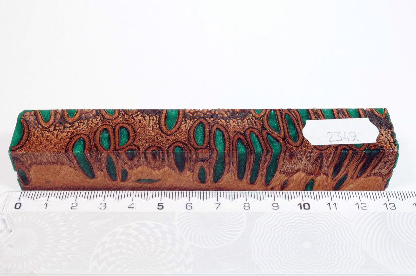 Die Samenöffnungen wurden mit gefärbtem Kunstharz unter Vakuum verfüllt und zu Pen Blanks verarbeitet