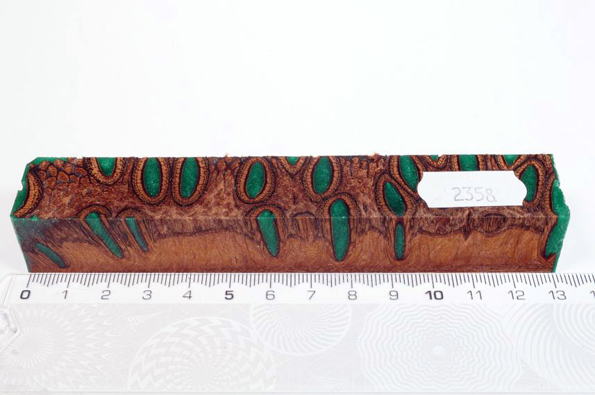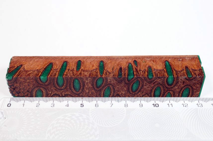 Die Samenöffnungen wurden mit gefärbtem Kunstharz unter Vakuum verfüllt und zu Pen Blanks verarbeitet