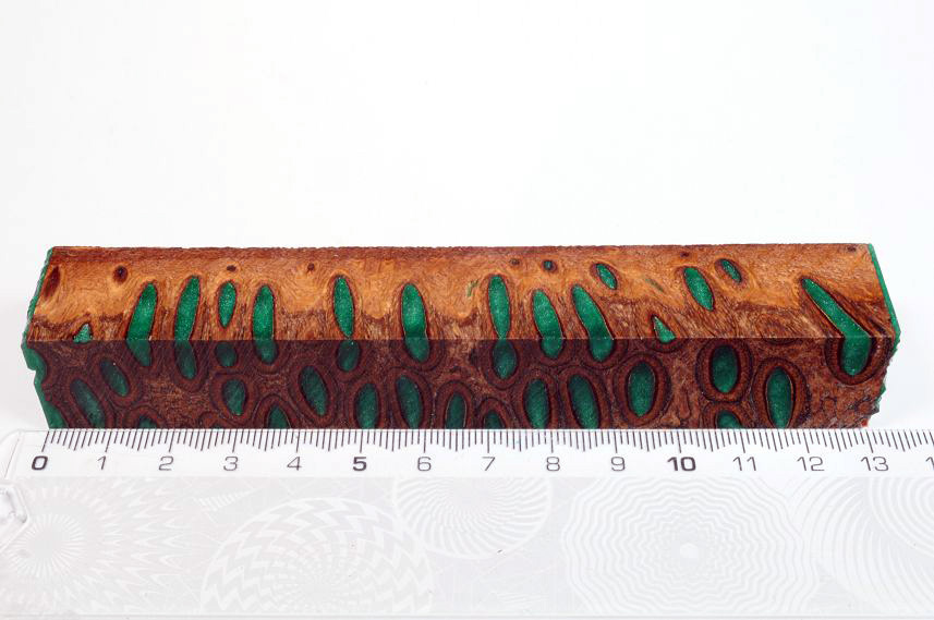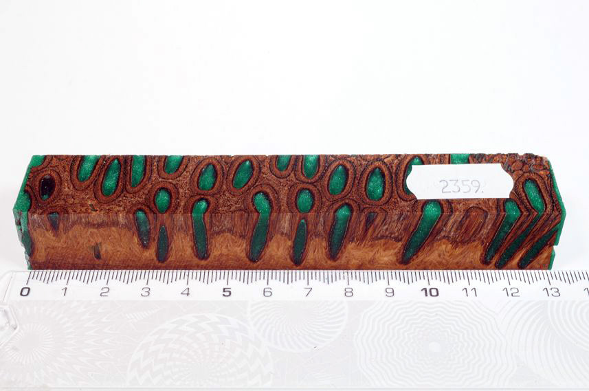 Die Samenöffnungen wurden mit gefärbtem Kunstharz unter Vakuum verfüllt und zu Pen Blanks verarbeitet