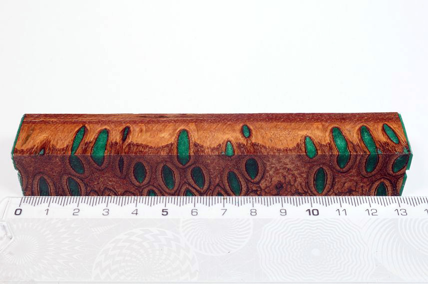 Die Samenöffnungen wurden mit gefärbtem Kunstharz unter Vakuum verfüllt und zu Pen Blanks verarbeitet