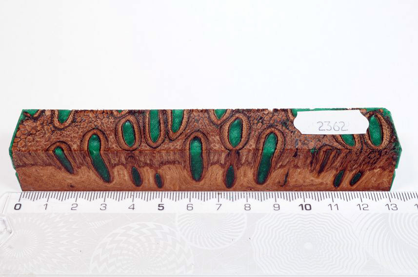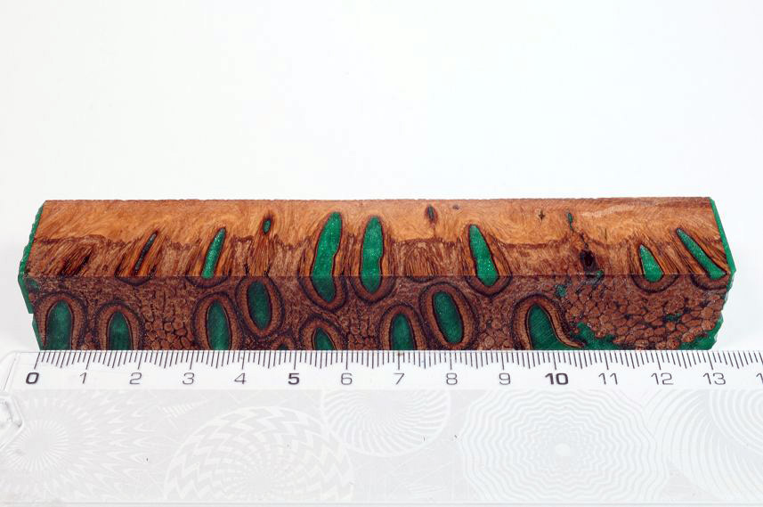 Die Samenöffnungen wurden mit gefärbtem Kunstharz unter Vakuum verfüllt und zu Pen Blanks verarbeitet