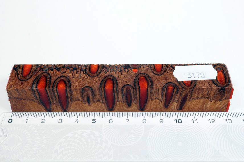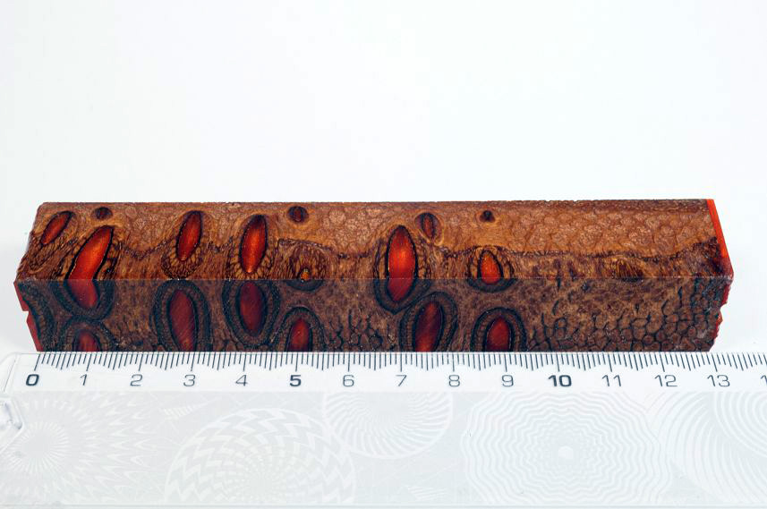 Die Samenöffnungen wurden mit gefärbtem Kunstharz unter Vakuum verfüllt und zu Pen Blanks verarbeitet