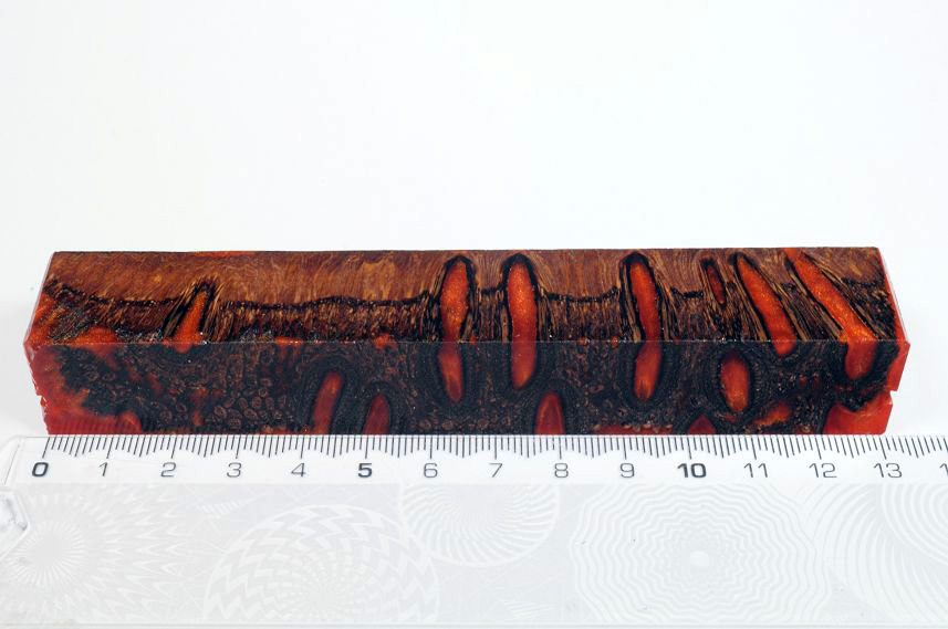 Die Samenöffnungen wurden mit gefärbtem Kunstharz unter Vakuum verfüllt und zu Pen Blanks verarbeitet