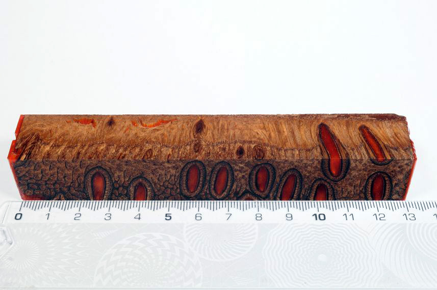 Die Samenöffnungen wurden mit gefärbtem Kunstharz unter Vakuum verfüllt und zu Pen Blanks verarbeitet