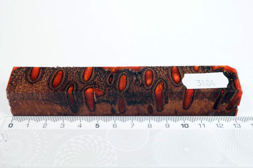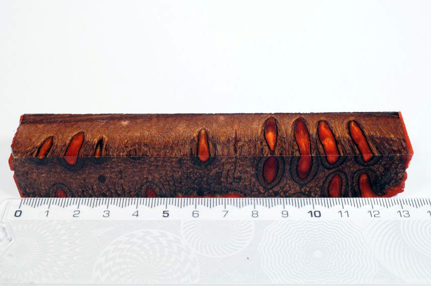 Die Samenöffnungen wurden mit gefärbtem Kunstharz unter Vakuum verfüllt und zu Pen Blanks verarbeitet