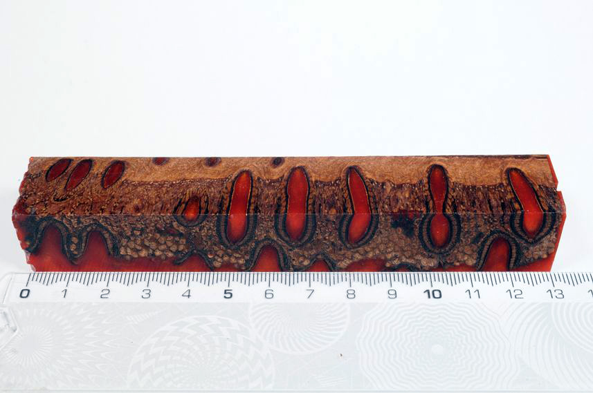Die Samenöffnungen wurden mit gefärbtem Kunstharz unter Vakuum verfüllt und zu Pen Blanks verarbeitet