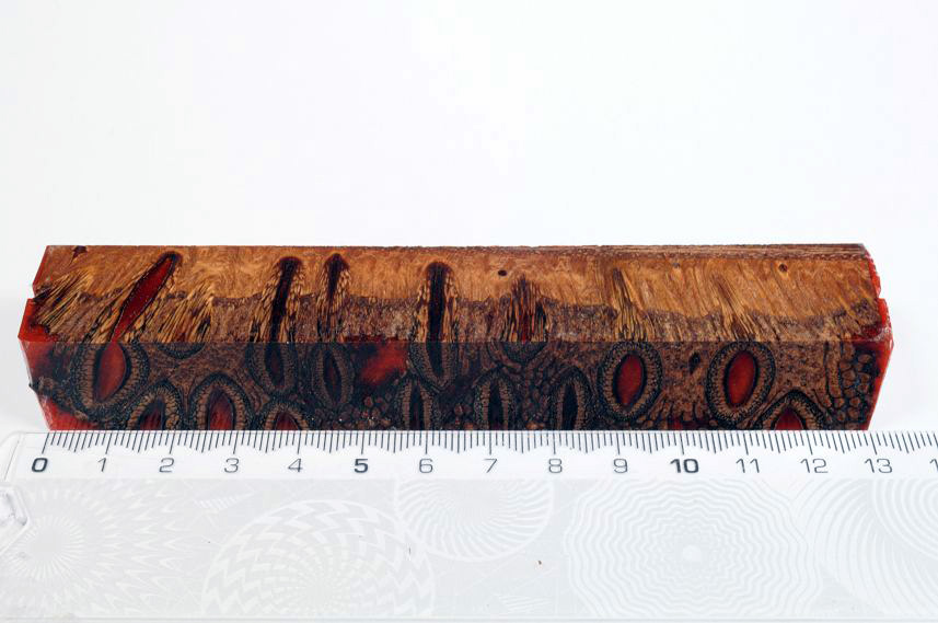 Die Samenöffnungen wurden mit gefärbtem Kunstharz unter Vakuum verfüllt und zu Pen Blanks verarbeitet