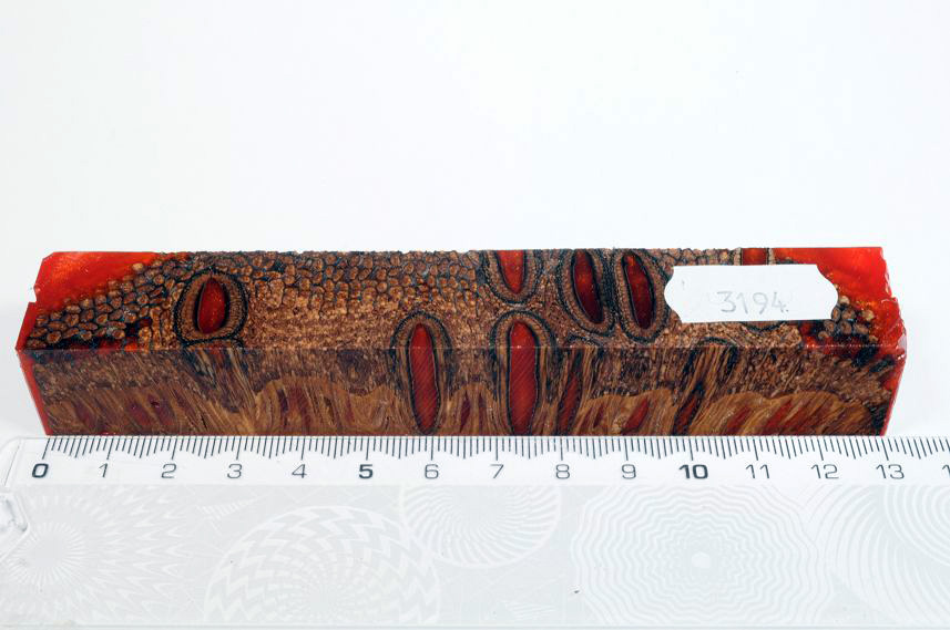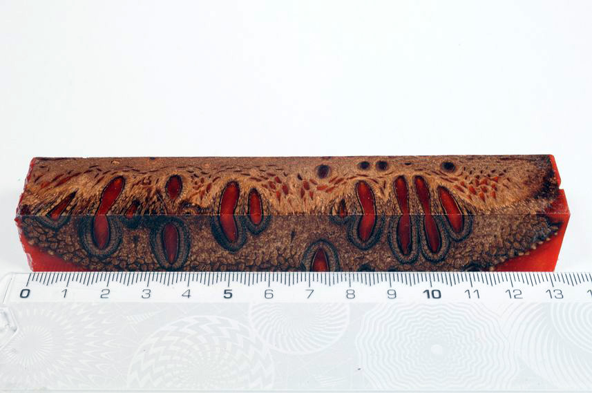 Die Samenöffnungen wurden mit gefärbtem Kunstharz unter Vakuum verfüllt und zu Pen Blanks verarbeitet
