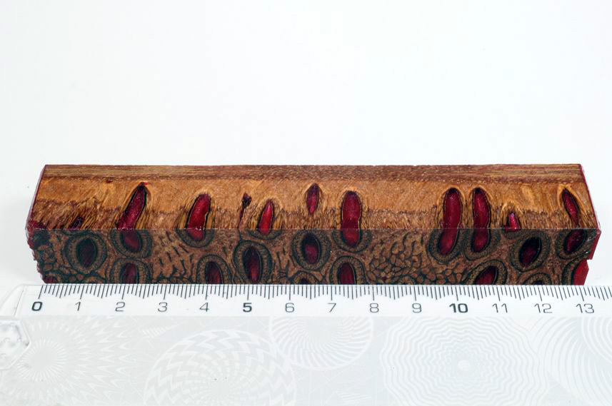Die Samenöffnungen wurden mit gefärbtem Kunstharz unter Vakuum verfüllt und zu Pen Blanks verarbeitet