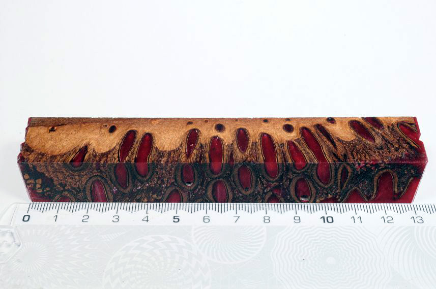 Die Samenöffnungen wurden mit gefärbtem Kunstharz unter Vakuum verfüllt und zu Pen Blanks verarbeitet