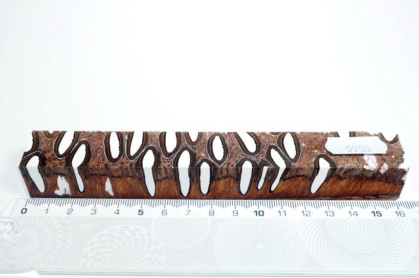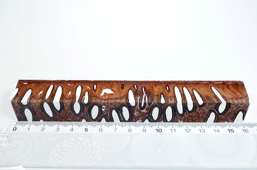 Die Samenöffnungen wurden mit gefärbtem Kunstharz unter Vakuum verfüllt und zu Pen Blanks verarbeitet