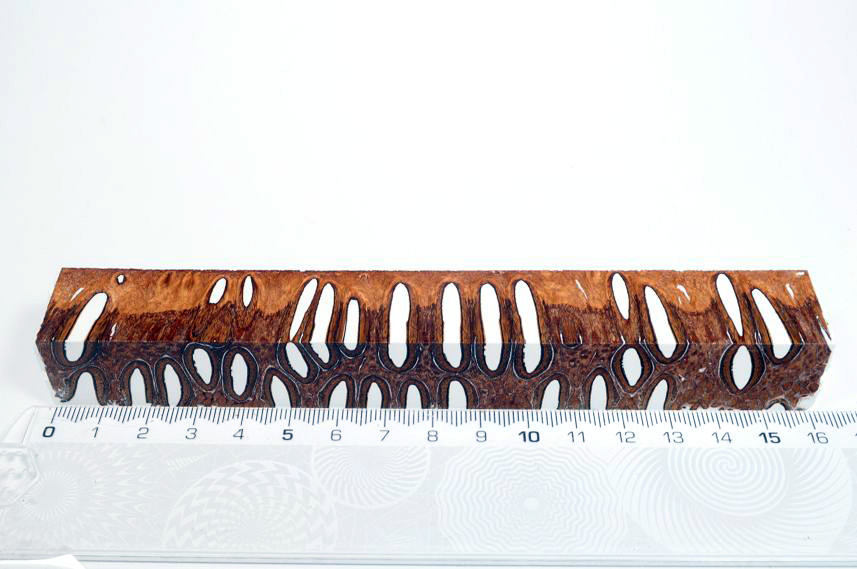 Die Samenöffnungen wurden mit gefärbtem Kunstharz unter Vakuum verfüllt und zu Pen Blanks verarbeitet