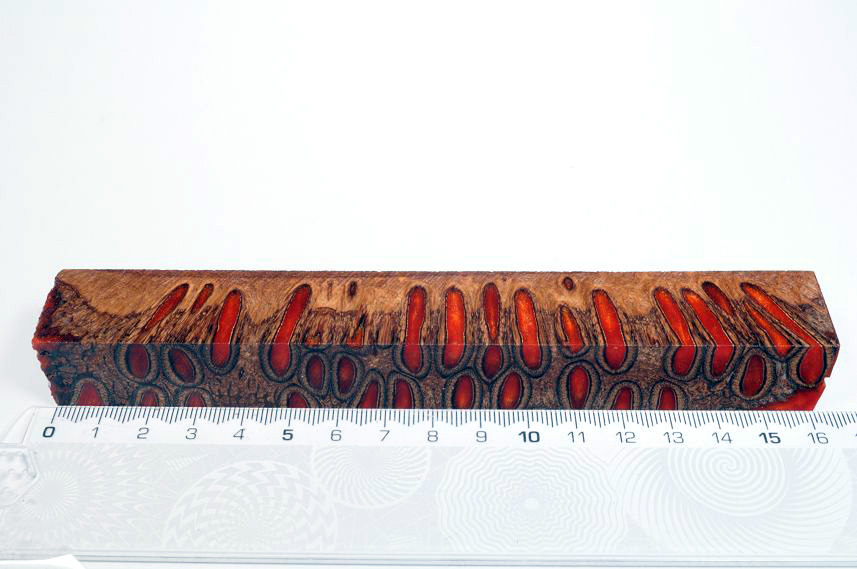 Die Samenöffnungen wurden mit gefärbtem Kunstharz unter Vakuum verfüllt und zu Pen Blanks verarbeitet