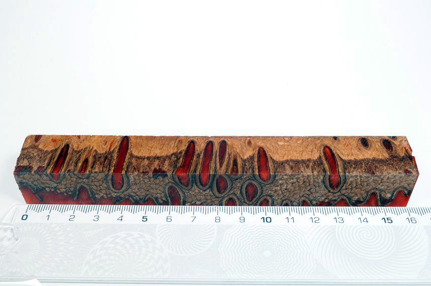 Die Samenöffnungen wurden mit gefärbtem Kunstharz unter Vakuum verfüllt und zu Pen Blanks verarbeitet