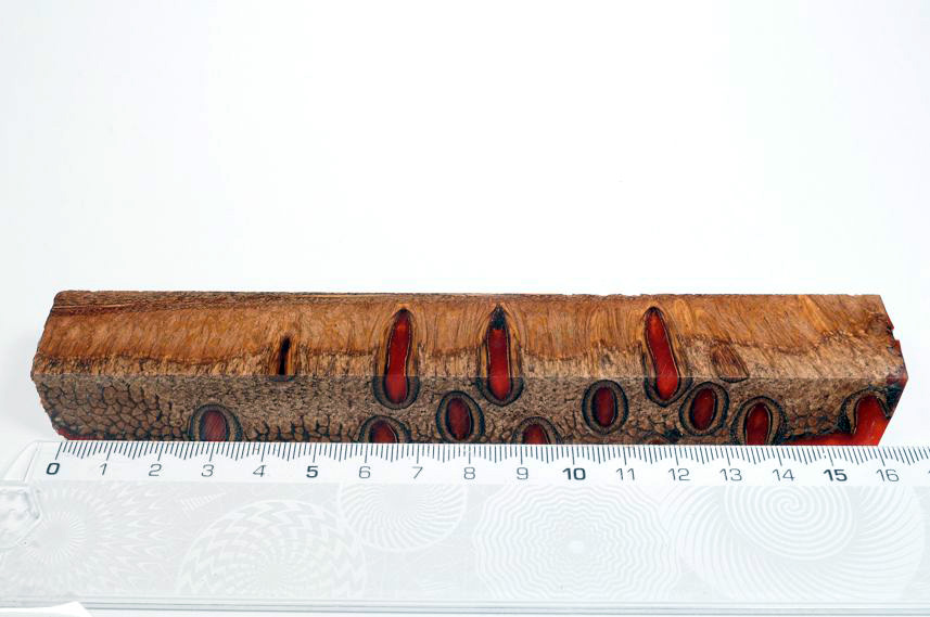Die Samenöffnungen wurden mit gefärbtem Kunstharz unter Vakuum verfüllt und zu Pen Blanks verarbeitet
