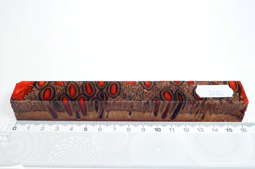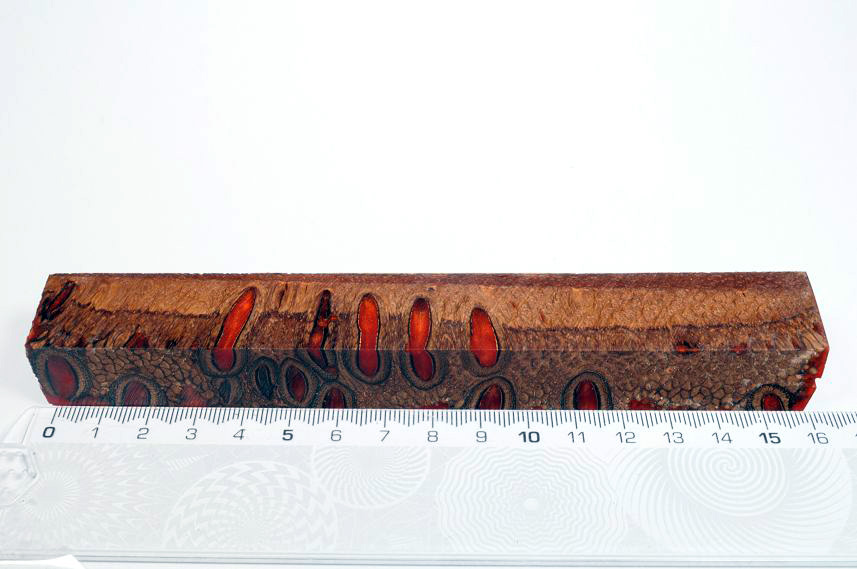 Die Samenöffnungen wurden mit gefärbtem Kunstharz unter Vakuum verfüllt und zu Pen Blanks verarbeitet