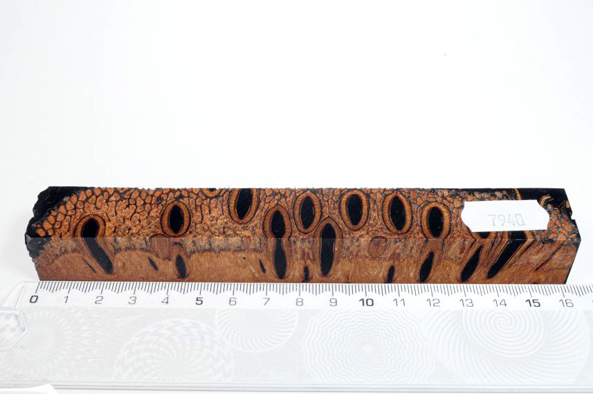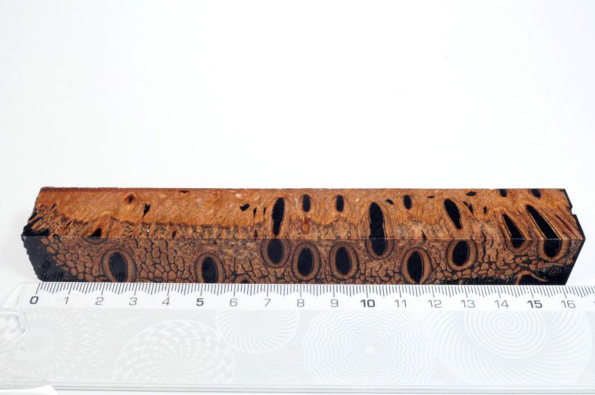 Die Samenöffnungen wurden mit gefärbtem Kunstharz unter Vakuum verfüllt und zu Pen Blanks verarbeitet